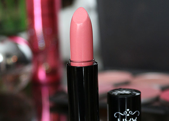 NYX Gala Round Lipstick ($4) is described as a soft blue-toned pink with shimmer. It's a very light pink, and applies a bit lighter than it looks in the tube. It's slightly too light for me, but it'd work great for mixing, and when worn alone it'd look best on fair, light and light-medium skin tones.I really like NYX Round Lipsticks — they are great for the price, but not every shade is created equal. Some are very pigmented and apply great, while some (like Gala) take several coats for opaque color and can apply uneven. The majority of the Round Lipsticks I've purchased have been pretty good.
